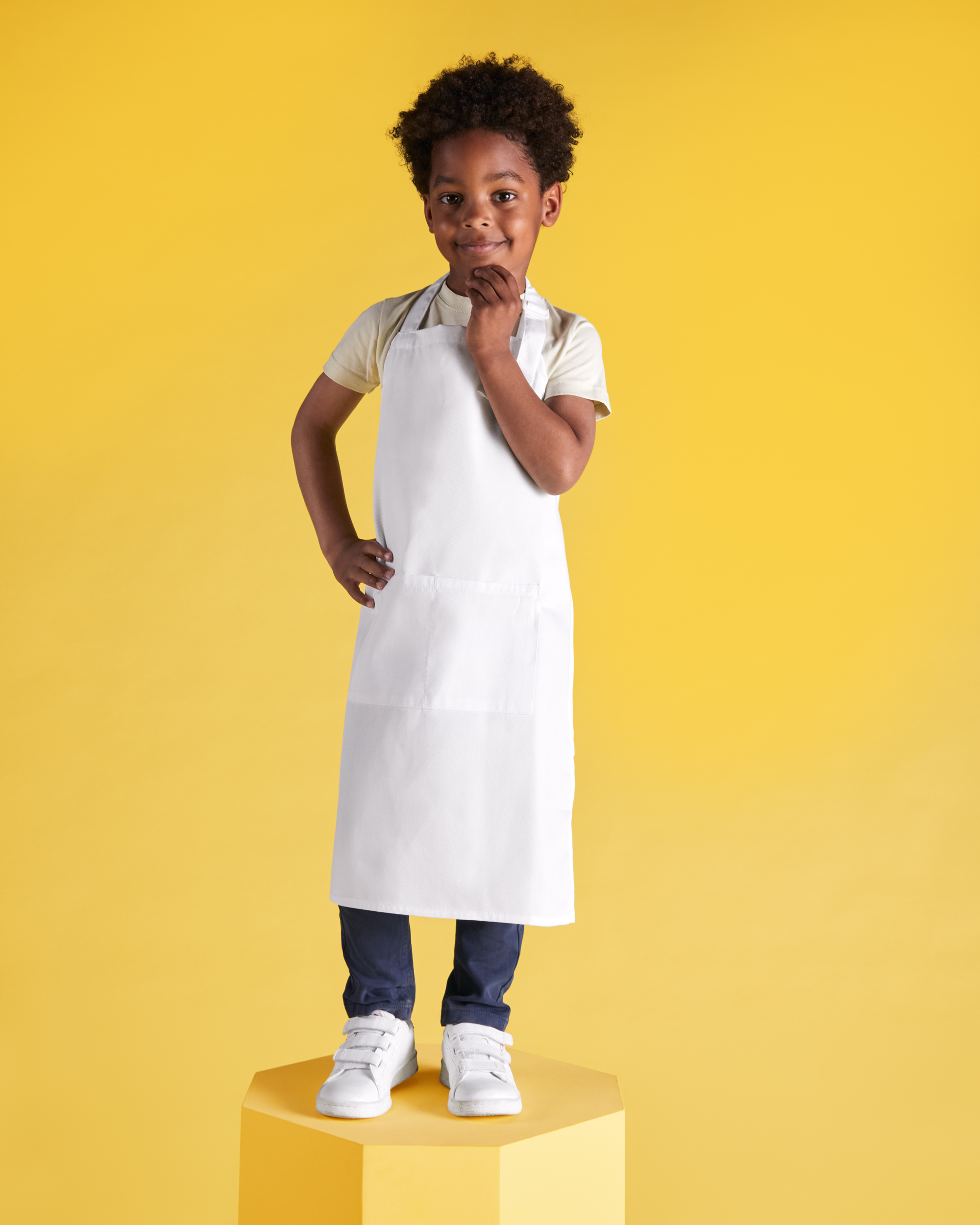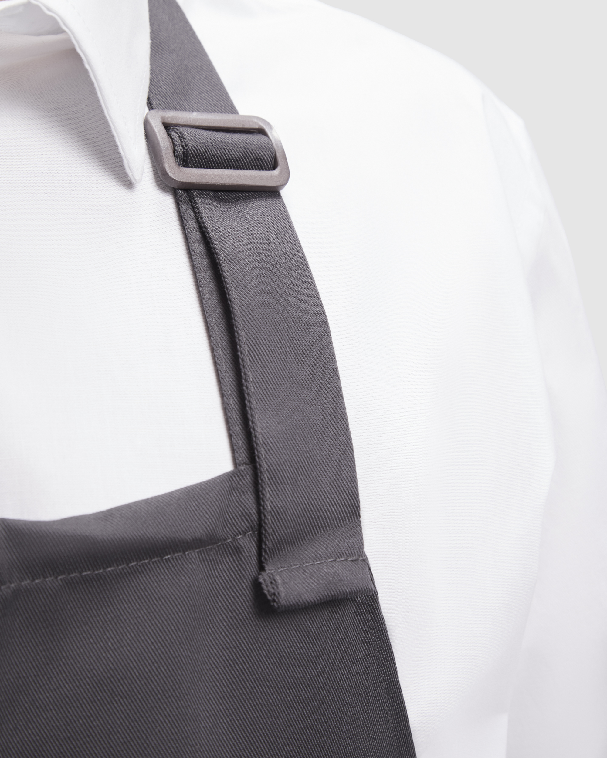 Delantal largo de sarga. Tirante con cierre ajustador de plástico. Cintas laterales para lazada. Bolsillo frontal con costura en el centro.
