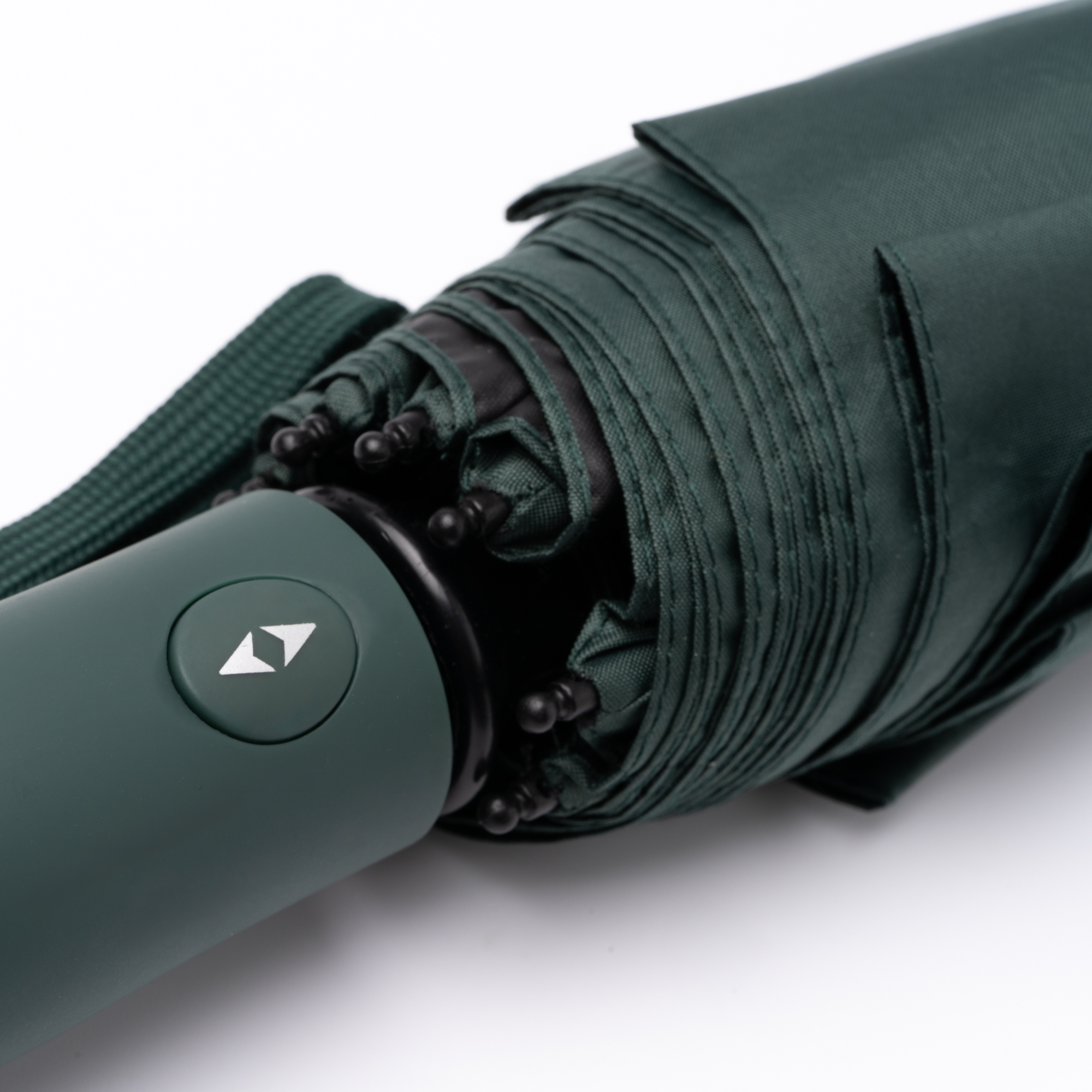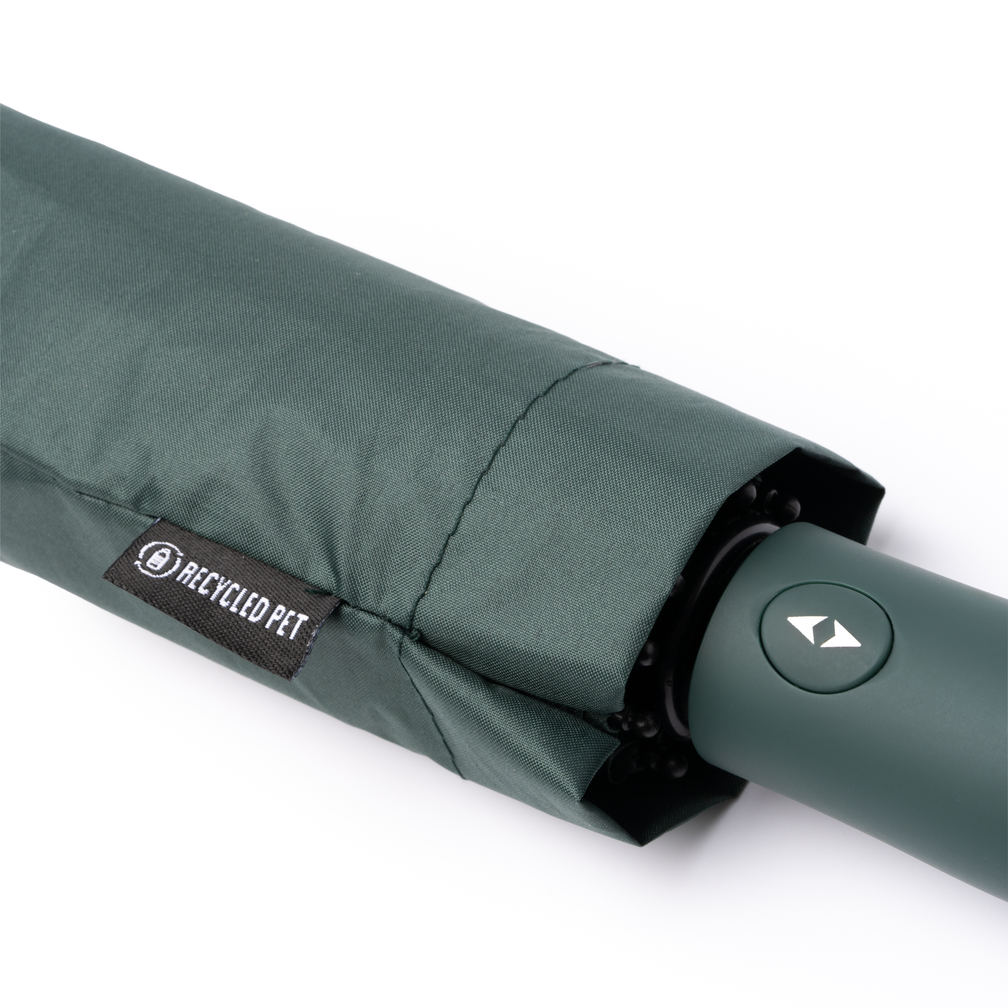 Paraguas plegable realizado en RPET y tejido pongee 190T con protección ultravioleta UV SPF50. Apertura y cierre automático, con varillas de fibra de vidrio con sistema antiventisca. Todo esto lo convierte en una opción completa y práctica, su sistema antiventisca lo hace más resistente y además te protege de los rayos ultravioleta. Cuenta con cierre de velcro. Incluye funda a juego.