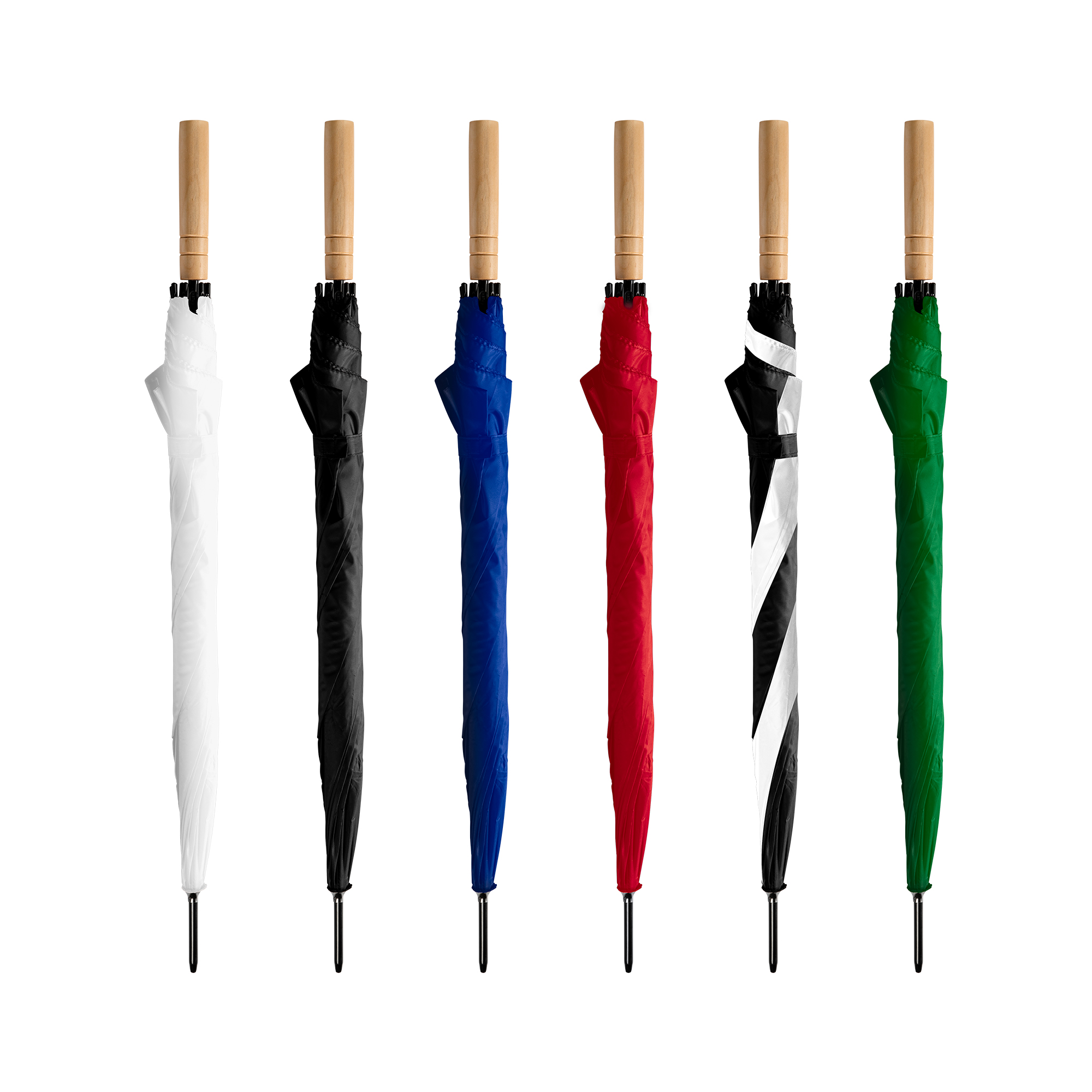 Paraguas con mango en madera y apertura automática. Cuenta con varillas y terminaciones en negro. Además, incluye cierre con velcro.