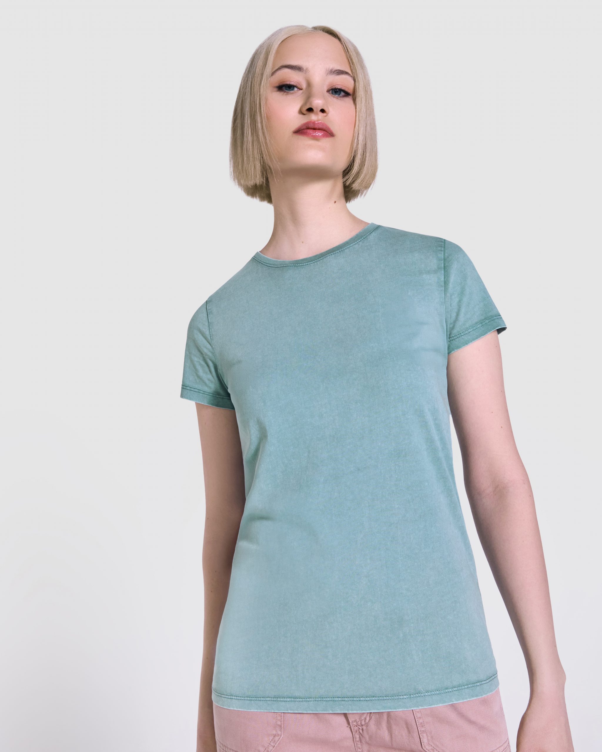 Camiseta de mujer de manga corta100% algodón con acabado lavado ácido. Cuello redondo de canalé 1×1 y costuras laterales. Cubrecosturas en cuello a tono.