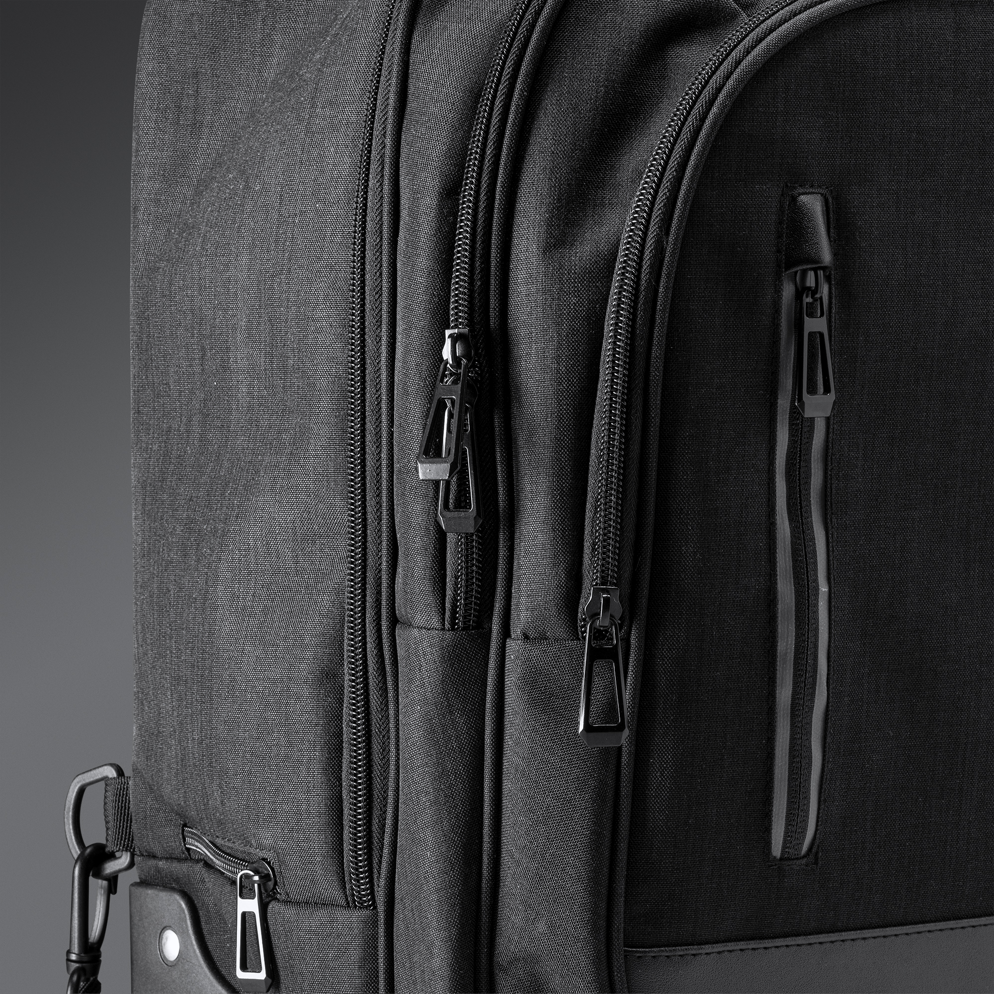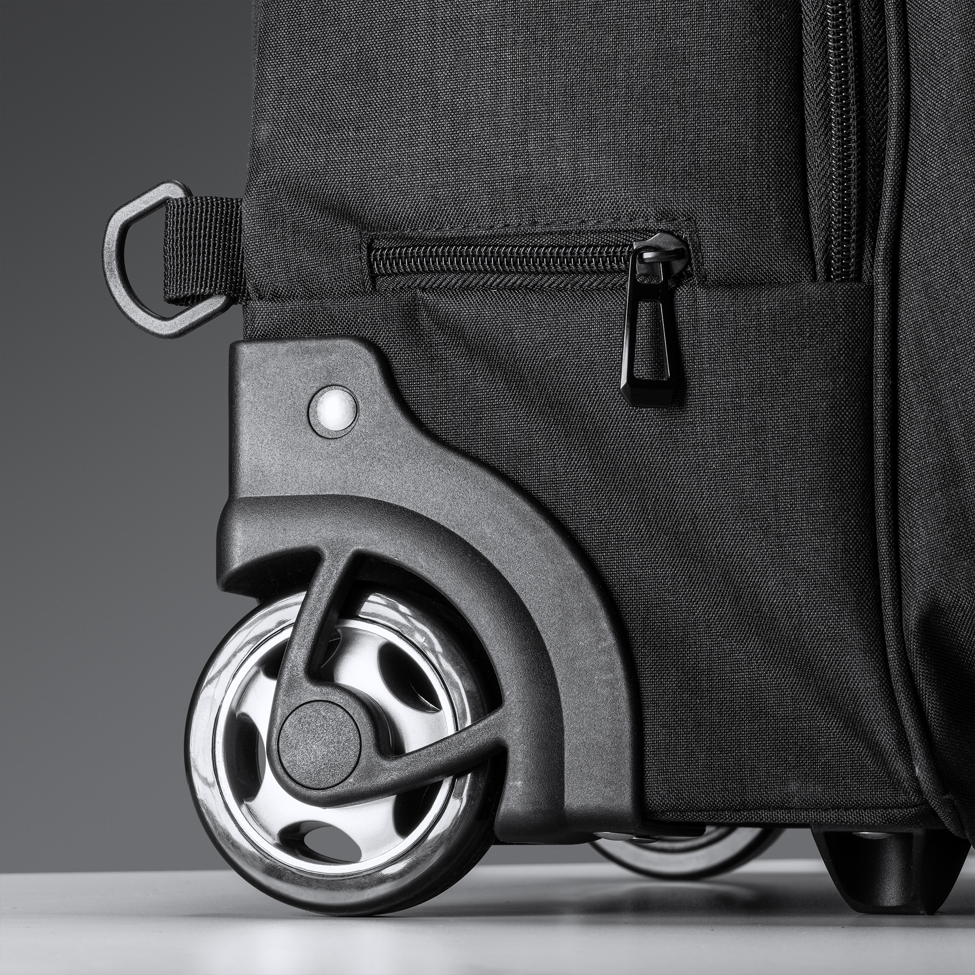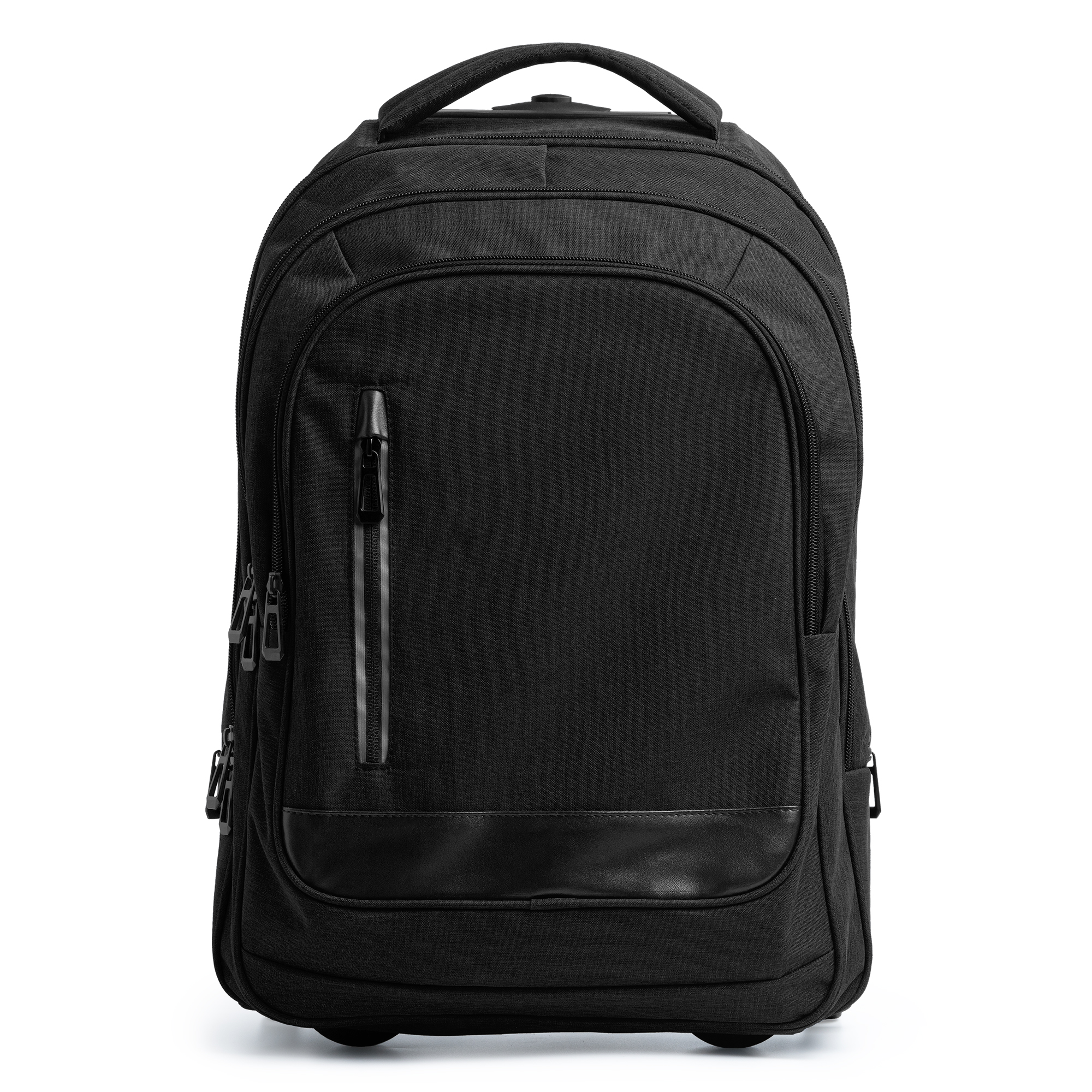 Trolley convertible en mochila. Realizado en poliéster 300D vigoré. Bolsillo principal de gran capacidad con compartimento interior acolchado ideal para portátil de hasta 17″. Dos bolsillos con compartimentos interiores y bolsillo frontal. Estructura de alta calidad y resistencia. Tiras acolchadas ajustables. Fundas cubre ruedas antimanchas. Apta para cabina.