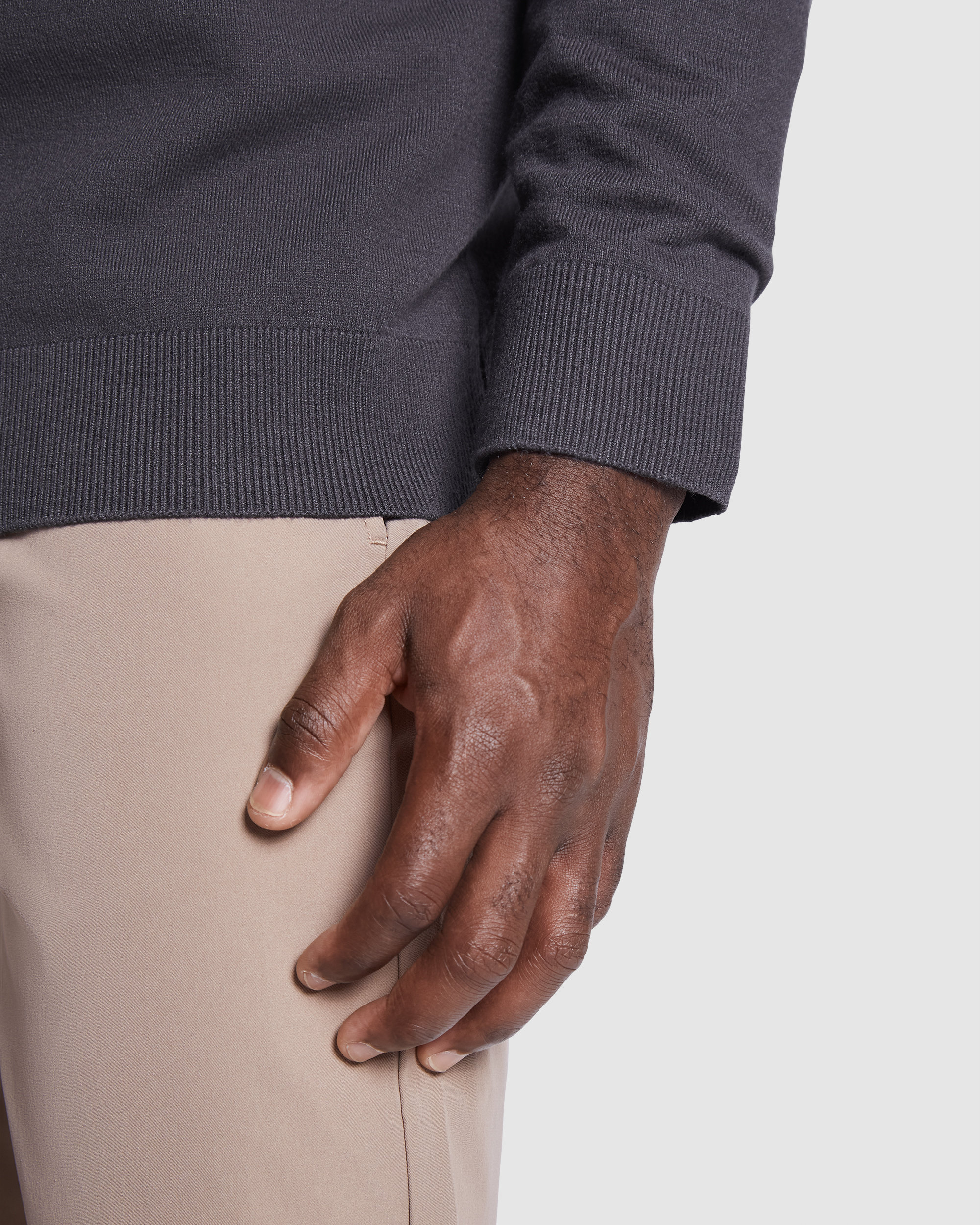 Acabado en punto de canalé 1×1 al tono en escote, puños y bajo.