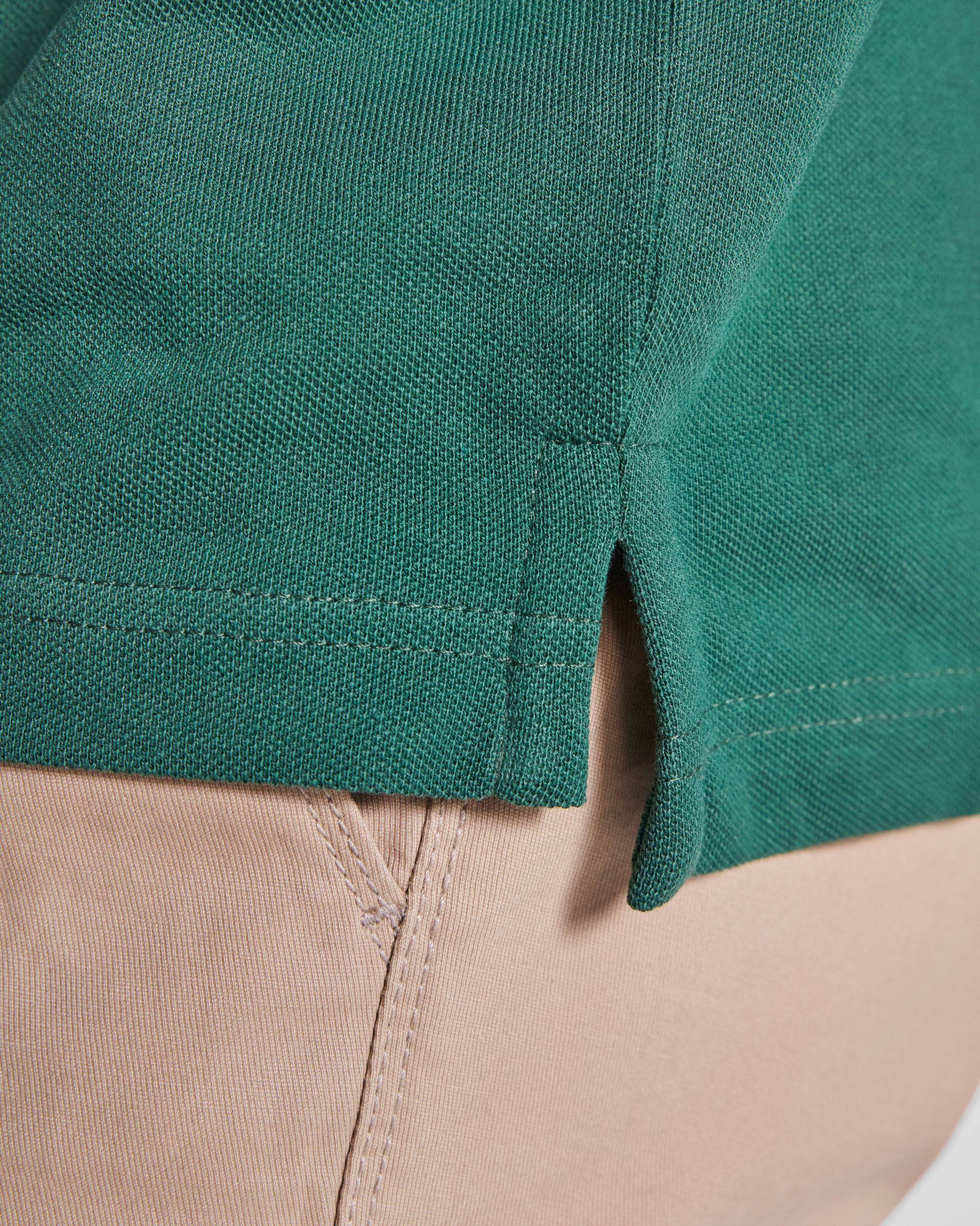 Polo de hombre con manga corta de alta calidad, en tejido confortable. Cuello con tapeta de tres botones a tono con el tejido. Solapa y ribete de la manga acanalado. Cubrecostura de refuerzo en el interior del cuello. Aperturas laterales con cubrecosturas a tono. El patronaje de la espalda es ligeramente más largo que el delantero. Doble costura en hombros, mangas y bajo de la prenda.