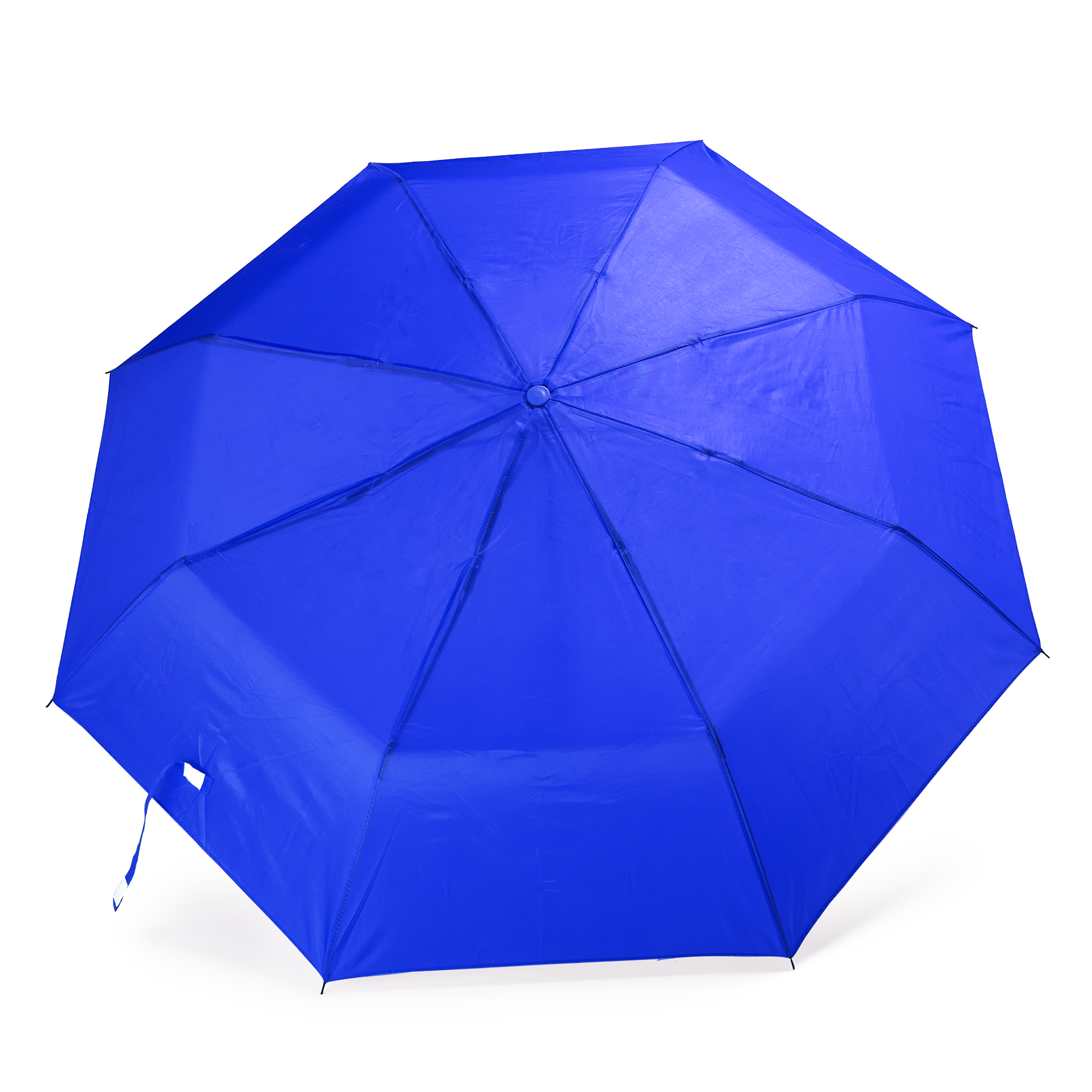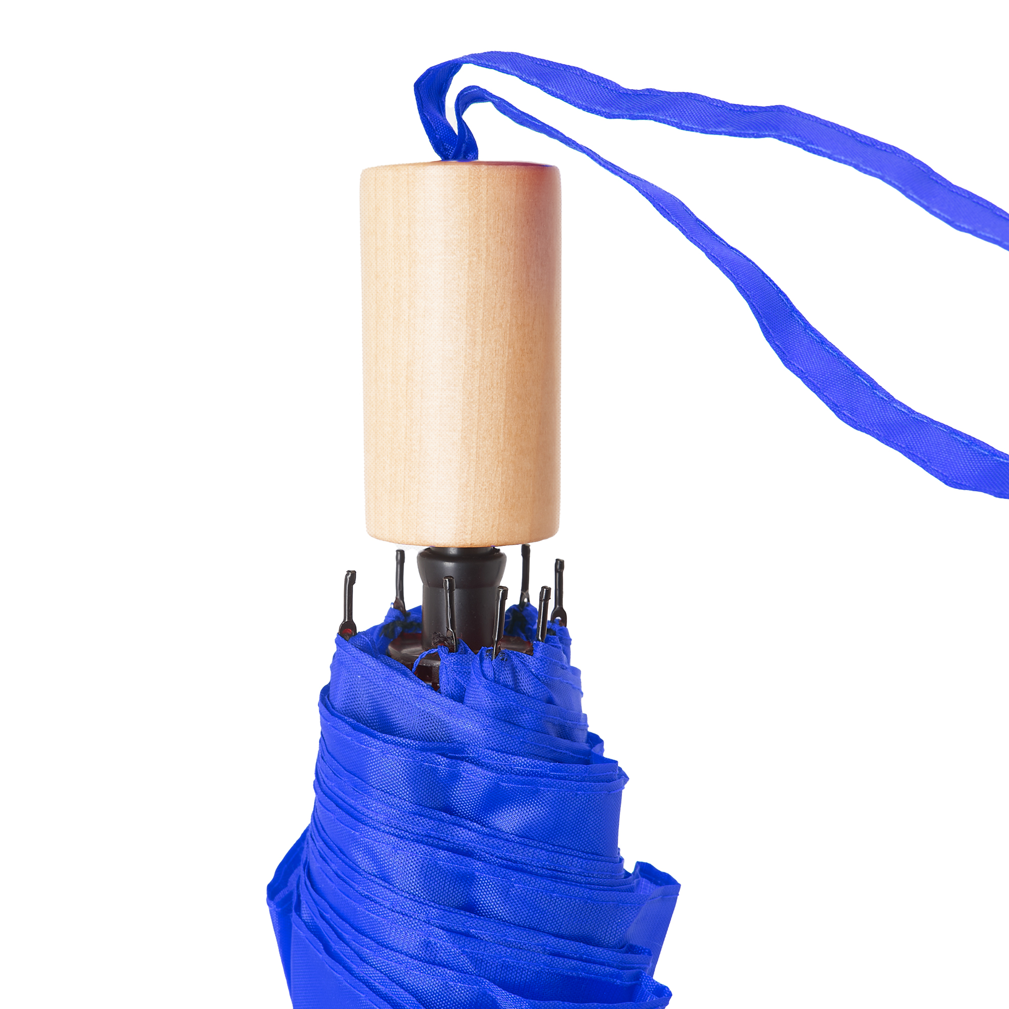 Paraguas plegable de RPET con funda a juego. Bastón, varillas y terminaciones en negro. Mango de madera natural. Cierre con velcro a juego y apertura manual. Diámetro 95 cm.
