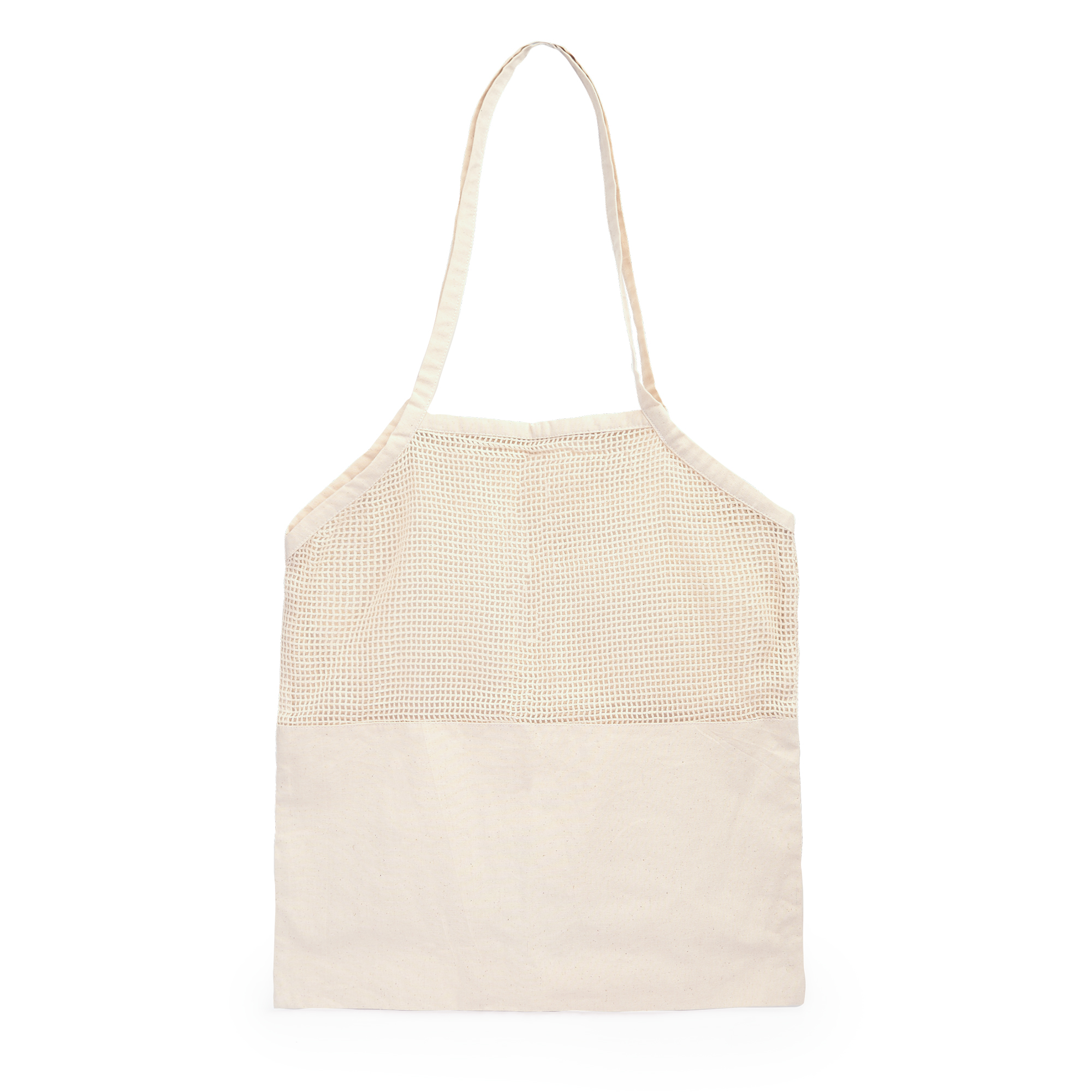 Bolsa para fruta 100% algodón en color natural con asas de 60 cm. Con un diseño que combina en mitad de la bolsa material suave y mitad en rejilla. Forma ergonómica para mejor transporte de productos.
