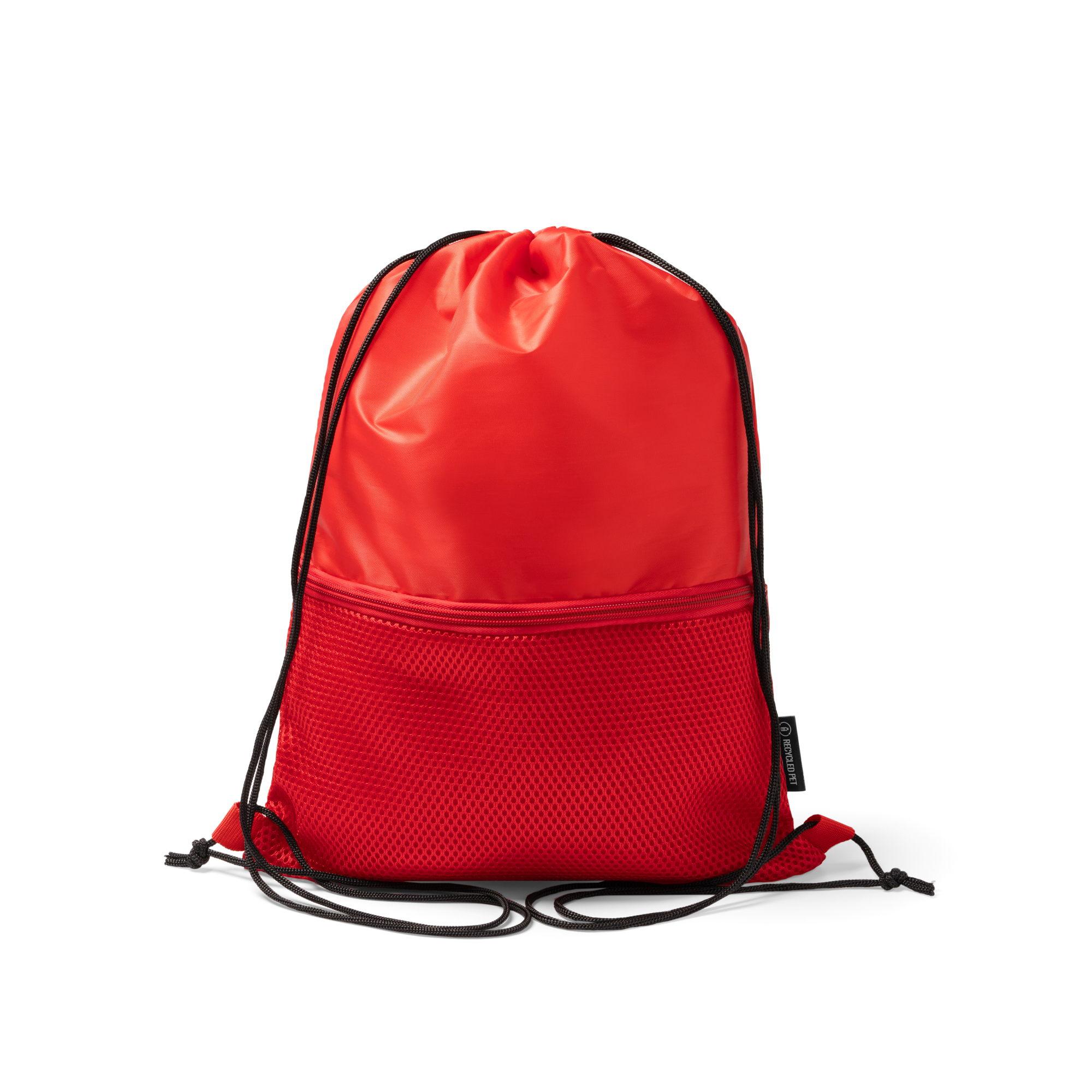 Mochila elaborada en RPET 210D de cuerdas ajustables, con bolsillo exterior en tejido acolchado con cierre de cremallera para el transporte de objetos más pequeños. Una opción práctica y segura para llevar tus objetos personales.