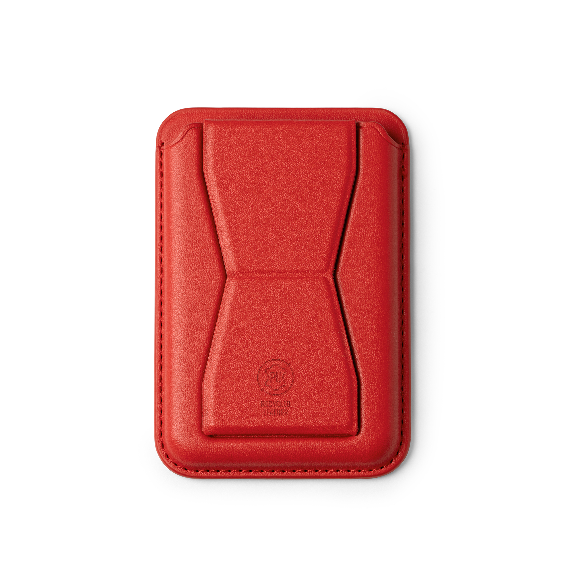 Tarjetero con soporte plegable realizado en PU reciclado. Un accesorio con múltiples opciones, pudiendo posicionar tu smartphone en horizontal y vertical a la par que llevas tus tarjetas contigo.