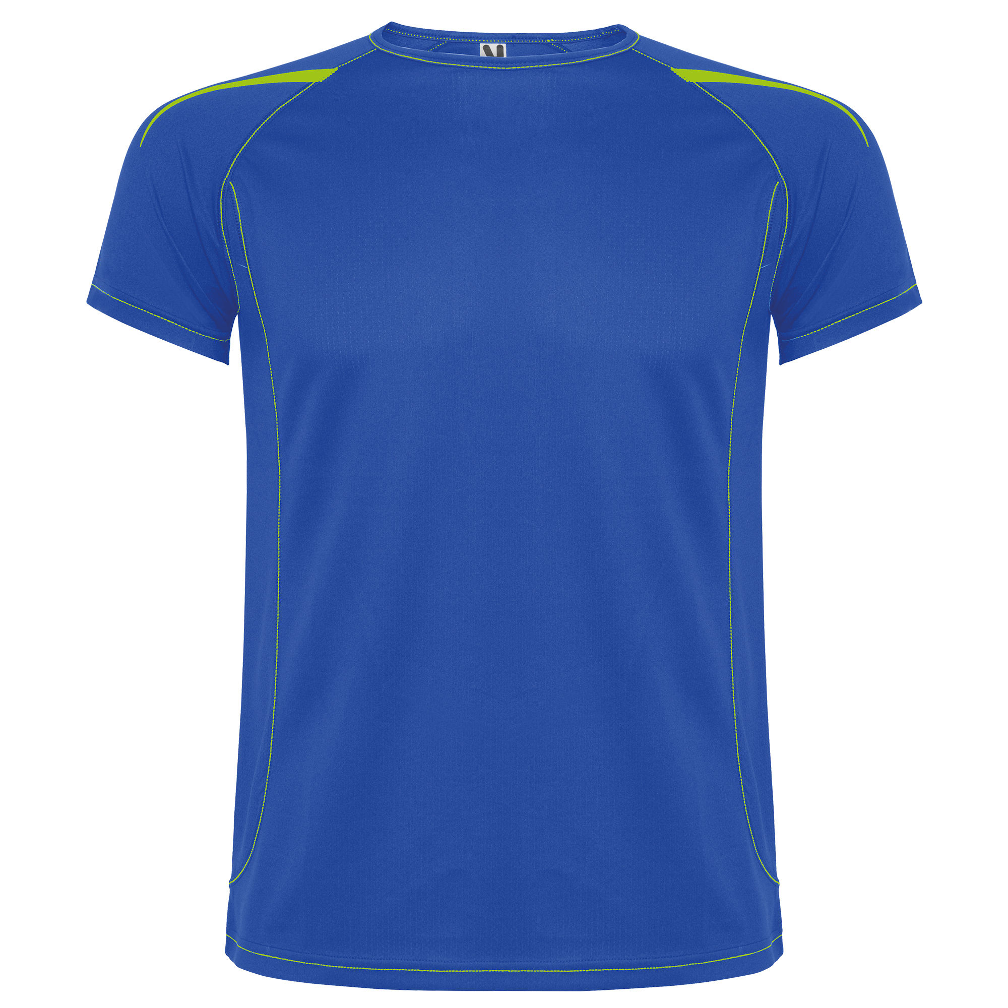 Camiseta técnica en tejido punto liso, de manga corta ranglán, con costuras en contraste en bocamangas, bajo, cuello y laterales. Cuello viveado con el mismo tejido. Tejido transpirable de fácil lavado y secado. Detalles reflectantes, excepto en colores negro y royal, que el detalle es en contraste en color amarillo, no reflectante.