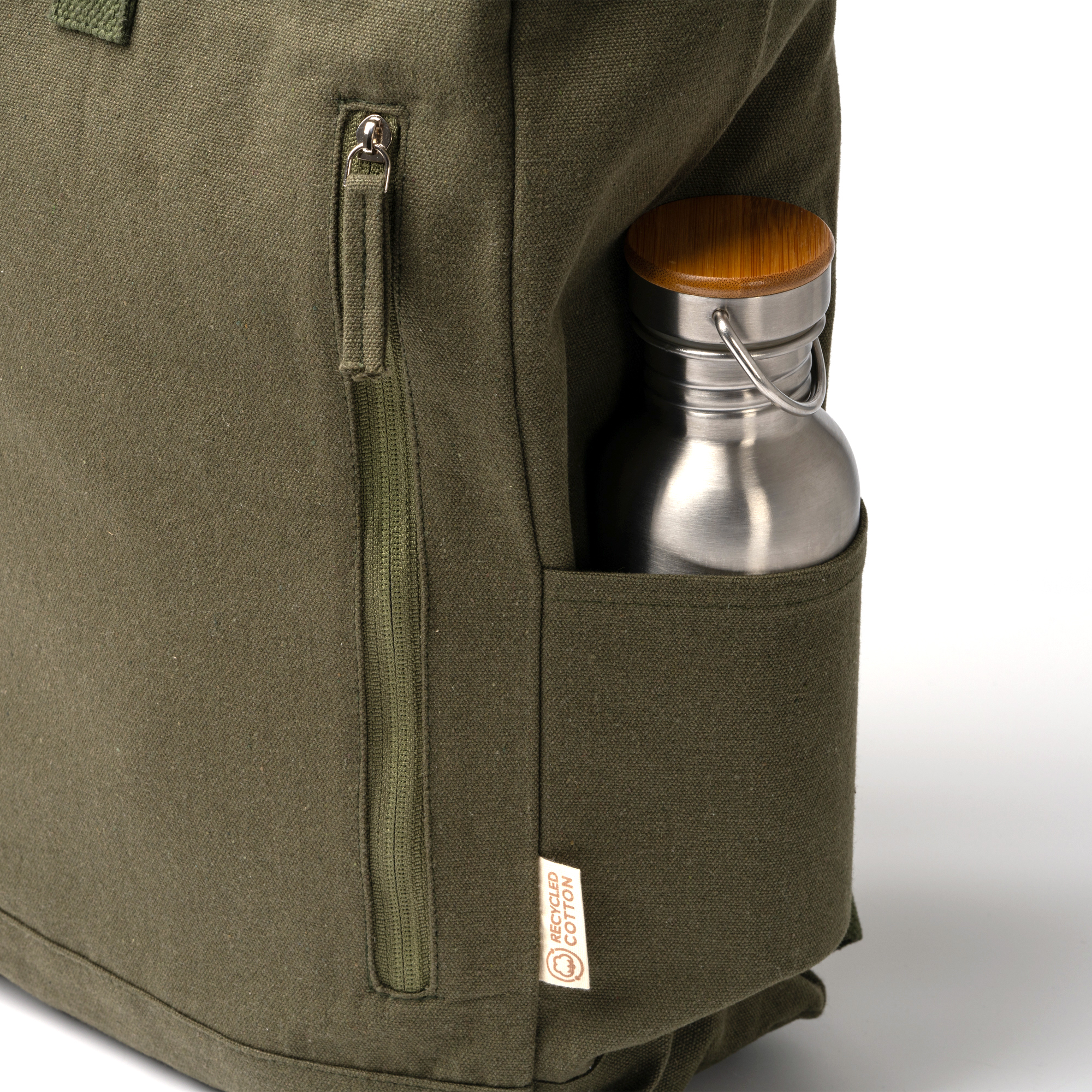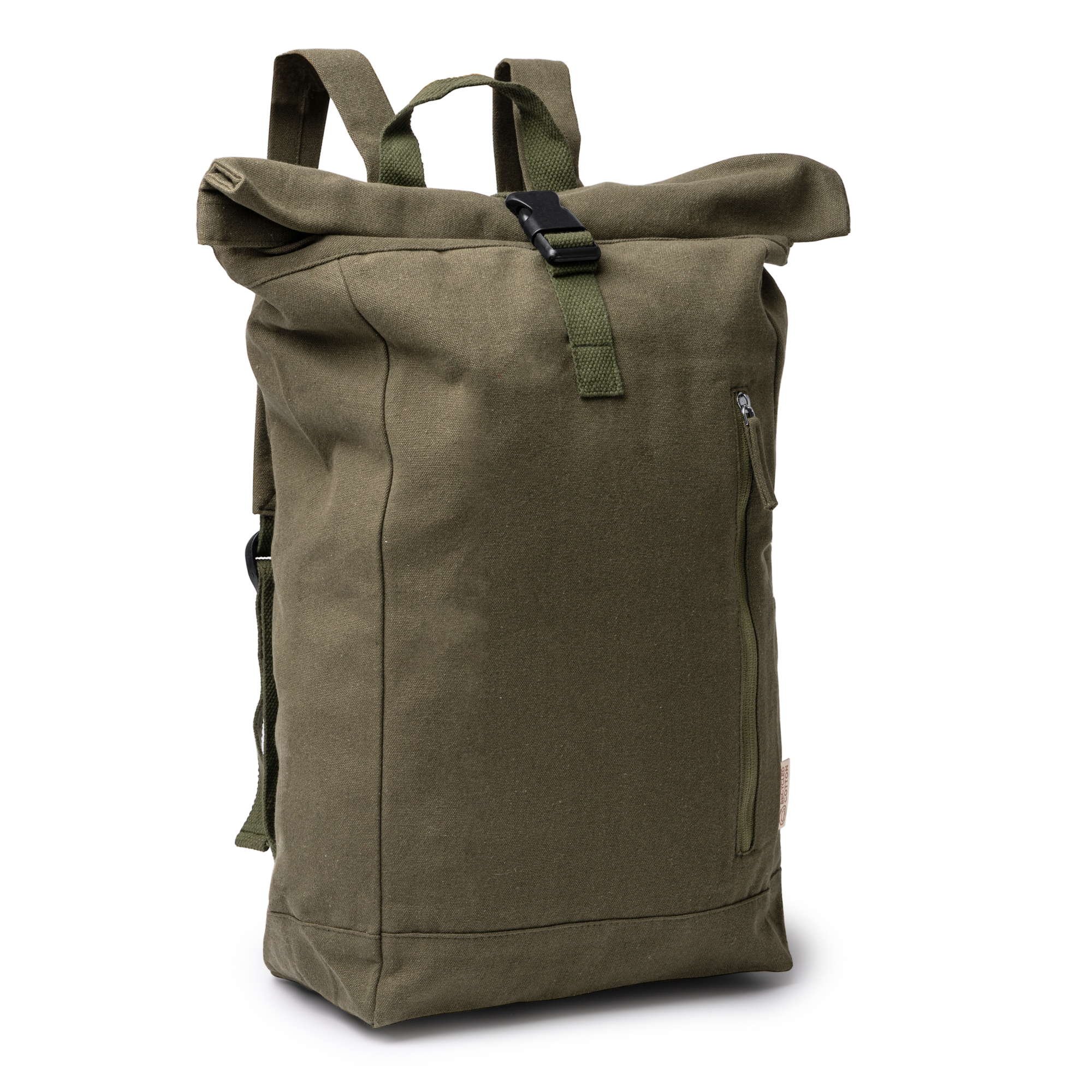 Mochila de algodón reciclado 370 g/m². Cuenta con un gran compartimento principal de apertura extensible con cremallera y ajustador para amplio almacenamiento, además de bolsillo frontal con cierre de cremallera y bolsillo lateral para el almacenamiento de pequeños enseres.