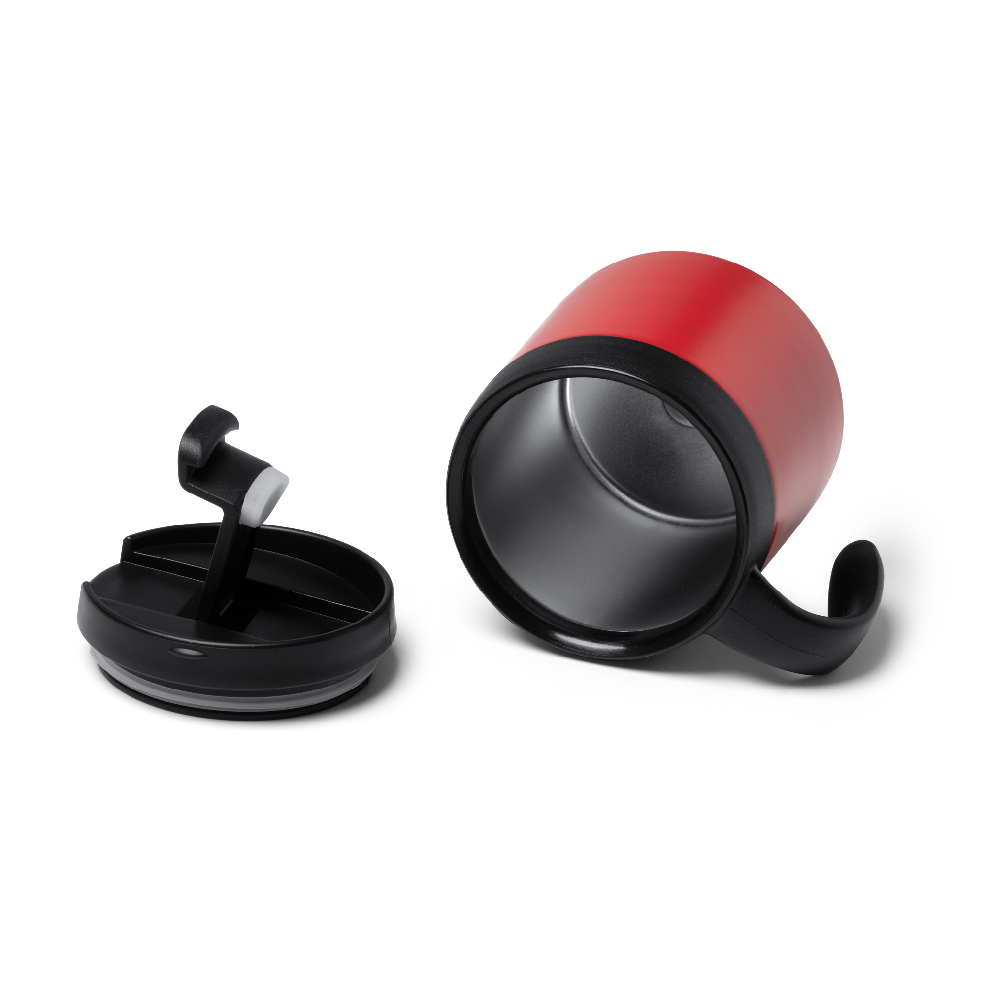 Taza de acero inoxidable 304 reciclado de doble pared. Con capacidad de 350ml. Cuenta con tapa dosificadora a rosca y refuerzo de silicona para evitar la caída de líquidos, además de asa con diseño ergonómico y tapón de cierre. Una taza térmica original a la vez que funcional.